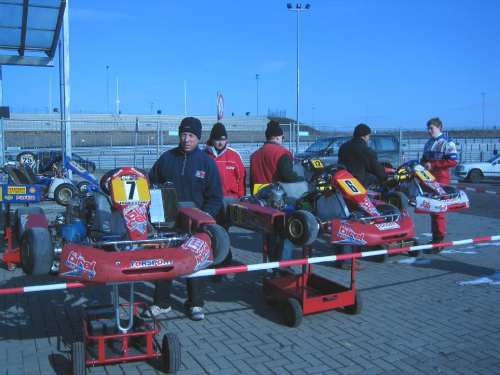 Die drei Sogat-Karts nach dem ersten Lauf im Parc Farme, Maiks Nase schon wieder arg demoliert ??