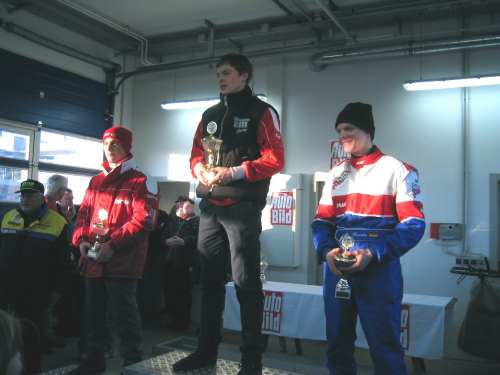 Beim zweiten Lauf konnte Maik den Start gewinnen, aber schon in der zweiten Runde, war von außen zu sehen, daß er langsamer wurde. Simon und Max hatten ihn dann bald ein- und überholt. Mit Mühe konnte Maik den dritten Platz behaupten. Wie sich später herausstellte, ist Maiks Motor, trotz der eisigen Kälte, zu heiß geworden und hat an Leistung verloren.