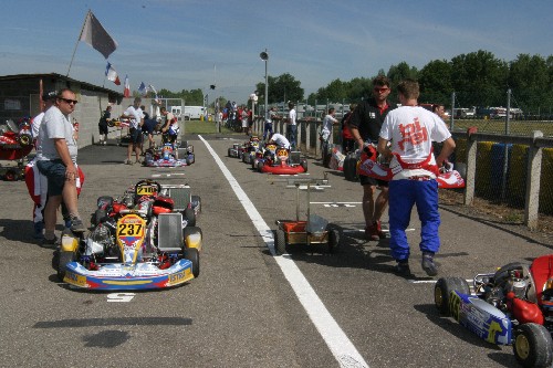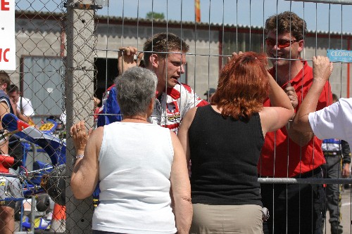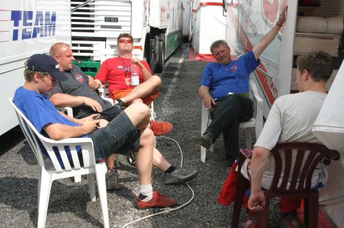 Am nächsten Morgen war ein Riesenstau vor der Einfahrt der Strecke, auch unser Chef mit dem LKW stand mittendrin. Die Einfahrt ins Fahrerlager sollte sich noch Stunden hinziehen. Die netten Franzosen ließen die LKW -Fahrer erst die Papierabnahme für ihre Fahrer machen, bevor sie ins Fahrerlager hinein durften.