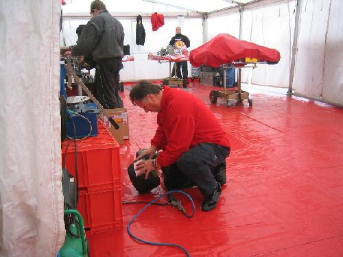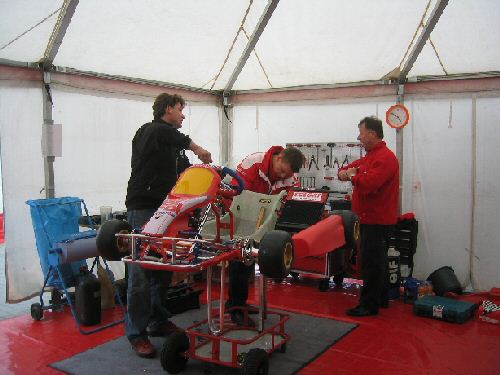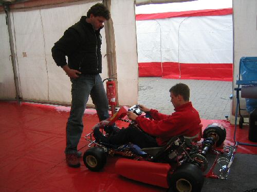 Maik war von Anfang an schnell unterwegs. Als er dann den Rennmotor einfahren wollte, fing es an zu regnen und wir mußten das Training erst einmal unterbrechen. Zum Nachmittag hin klappte dann aber noch alles.