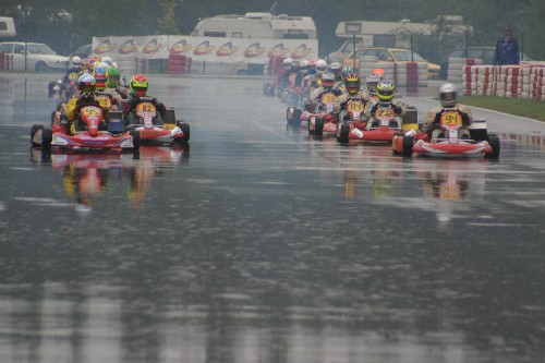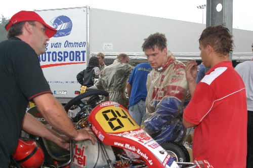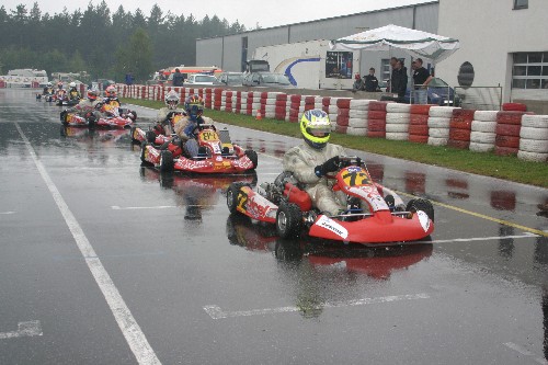 Der Verlauf im 1. Rennen, sollte uns auch nicht zufrieden stellen. Am Start kam Maik noch ganz gut weg, aber auf nasser Strecke und mitten im dicken Pulk, kam es zu einer Berührung und Maik flog von der Strecke. Obwohl er noch einige Plätze wieder gut machen konnte, wurde er am Ende auf Platz 9 abgewunken.